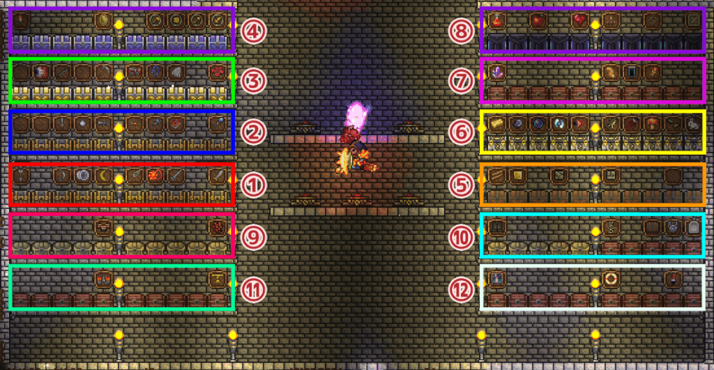 ちなみに、作成した倉庫はテラリア解説chさんの「全アイテムの仕分け方とテンプレート」を参考にしているので、よろしければこちらもご覧ください。
